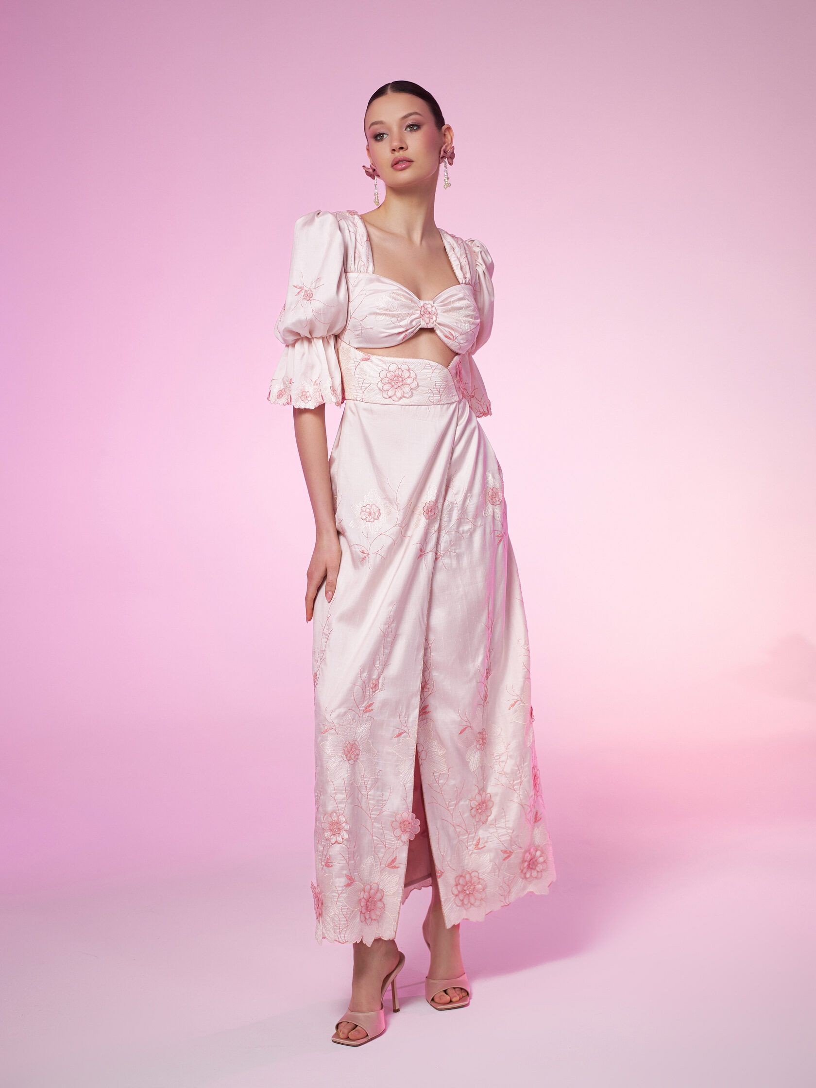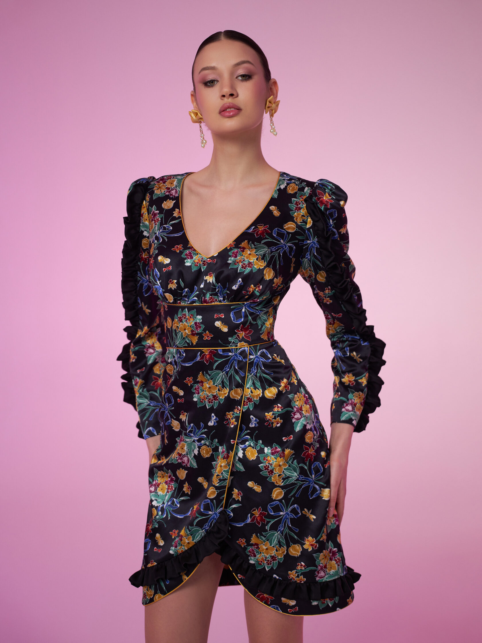 Платье из дикого шёлка, декорированное объёмными цветами, идеально для торжественных событий. Это уместный лук и для торжественного события, романтического свидания или особенного вечера. Платье из винтажного шёлка лёгкое и воздушное, оно делает силуэт элегантным и изысканным.